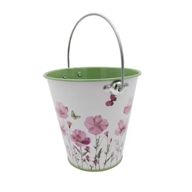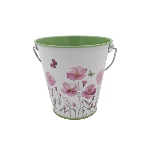 Pequeno balde em zinco, com asa. Decorado com flores, ideal para a primavera.