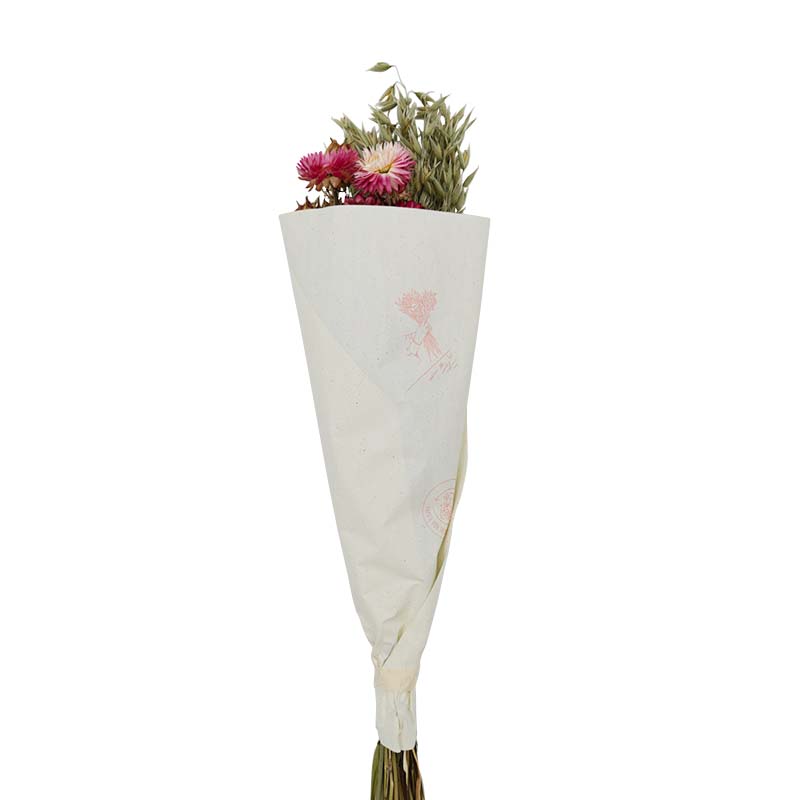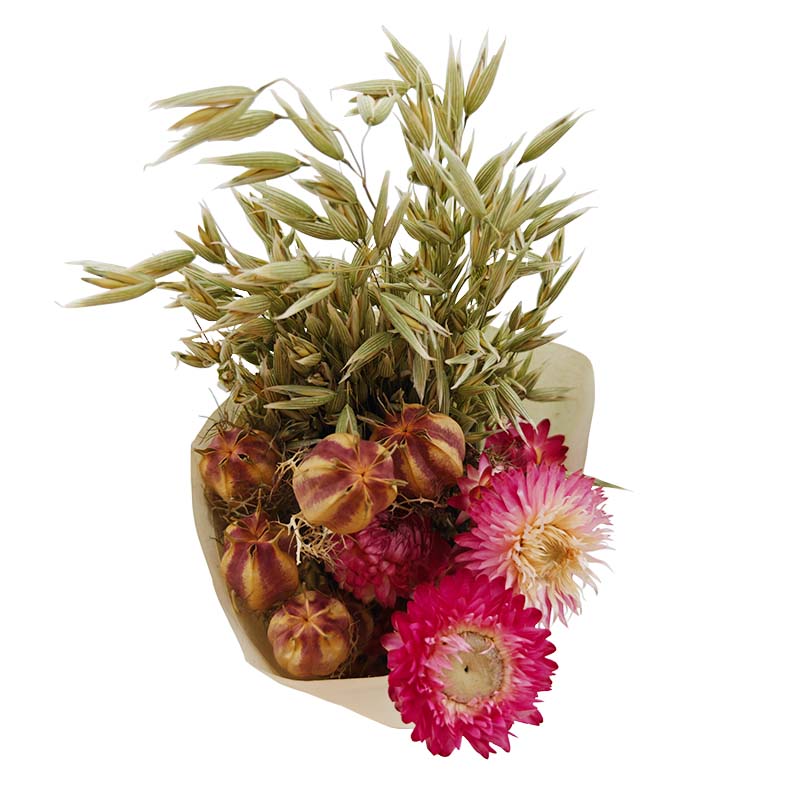 Bouquet de flores secas composto por aveia, flor de palha e nigella.