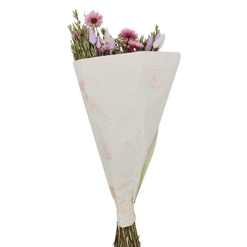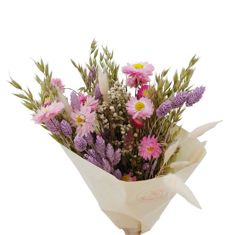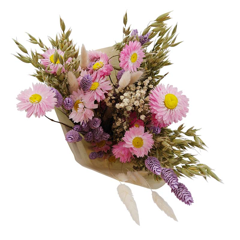Bouquet de flores secas composto por aveia, phalaris, flor de palha, vivaz e lagurus.