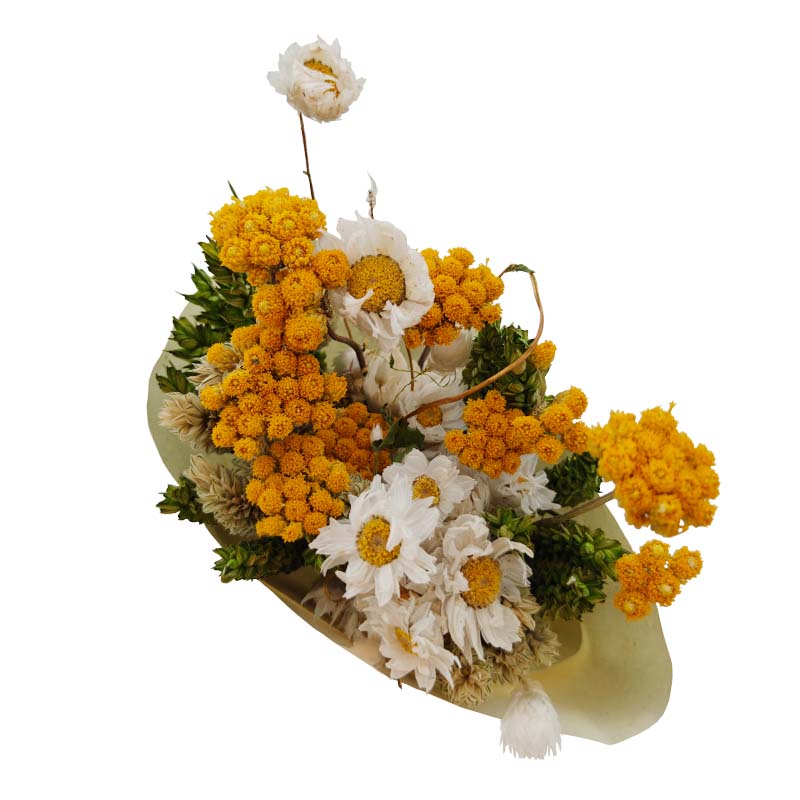 Bouquet de flores secas composto por espigas verdes, phalaris, flor de palha e achillea.