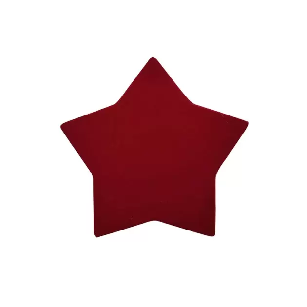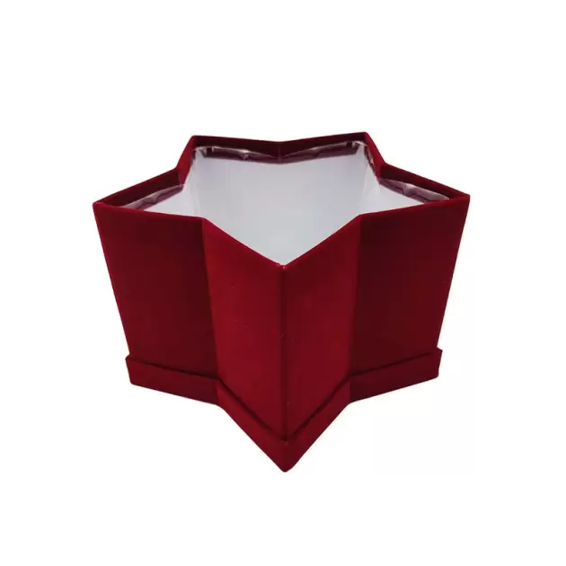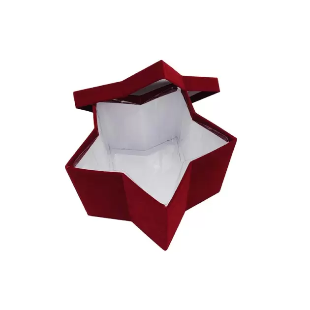 Caixa em cartão, com tampa, em forma de estrela. Forrada a veludo vermelho-escuro.