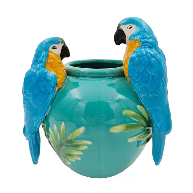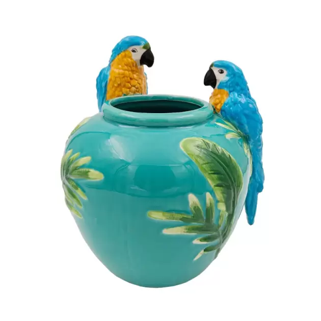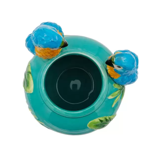 Vaso em cerâmica, na cor azul, decorado com folhas verdes e papagaios.